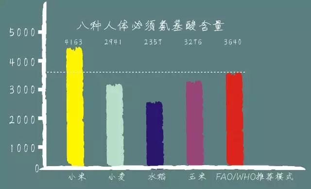 小米的氨基酸種類齊全,含有人體必需的八種氨基酸。除賴氨酸偏低外,其余均符合聯(lián)合國糧農(nóng)組織(FAO)和世界衛(wèi)生組織(WHO)所推薦的模式。