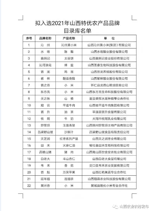 關于擬入選2021年山西特優(yōu)農產品品牌目錄庫名單的公示