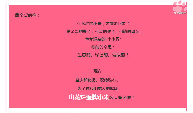 為了咱家人的健康,興縣山花爛漫牌小米只施天然有機肥,決不讓一?;蔬M農(nóng)田,絕不使用殺蟲劑、除草劑,人工種植、人工除草、人工收割,24小時追溯系統(tǒng)管理,粒粒小米精選,高品質的保證!